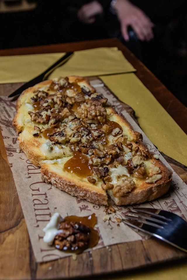 - Crema di gorgonzola, pera caramellata, miele e noci