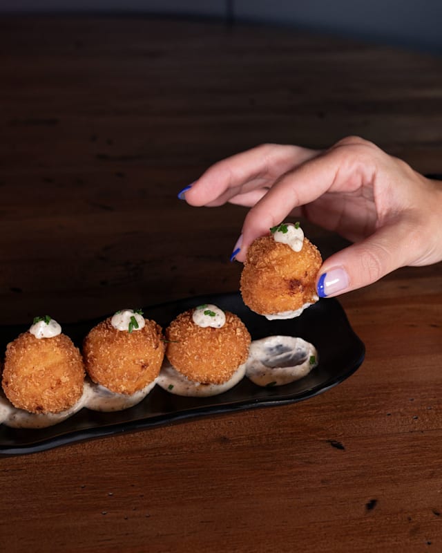 Croquetas de macarrones con queso cheddar rebozados, con salsa de mayo trufada.