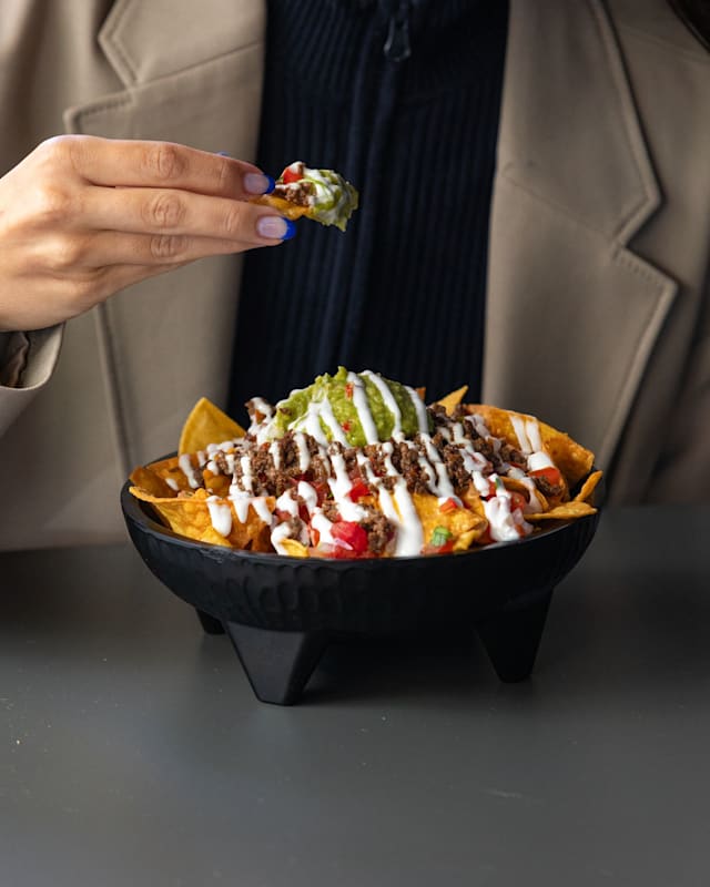 Nachos, carne de vaca gallega, queso cheddar, guacamole, pico de gallo y sour cream