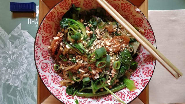 Noodles di riso saltati con verdure, coriandolo, uova, olio al peperoncino, lime e anacardi