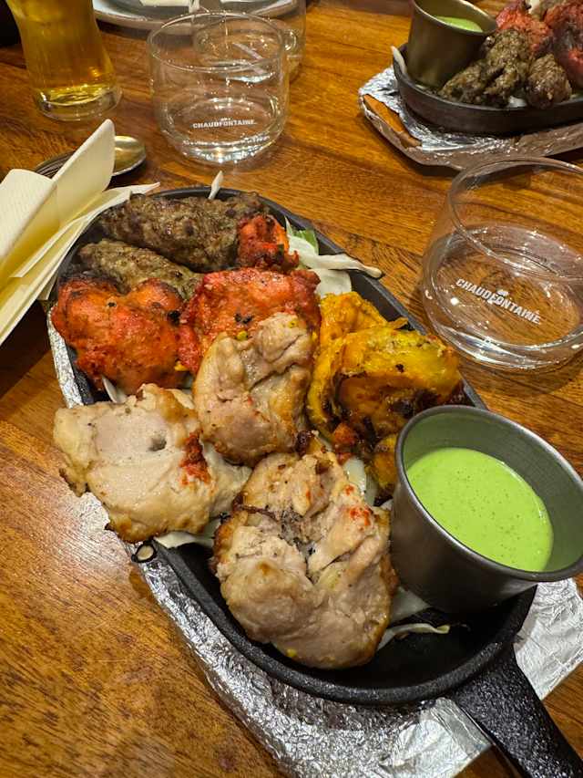 Assorted pieces of chicken tikka, murg malai tikka, lamb seek kebab and lasooni prawns on a sizzling hot plate.