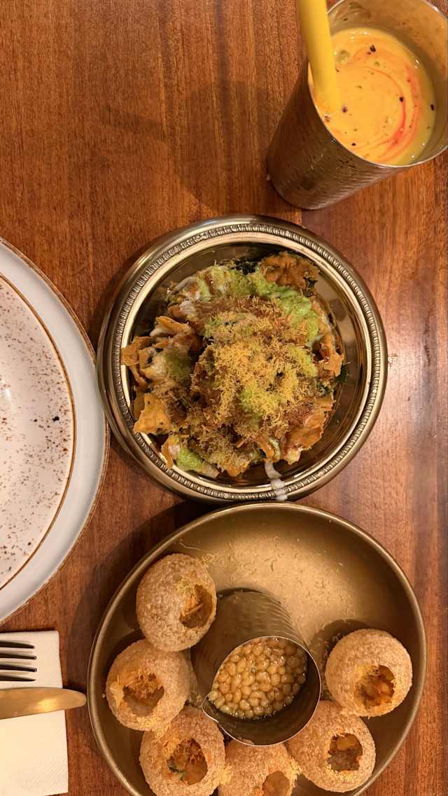 Crispy puris filled with yoghurt, spiced potatoes, sweet chutneys, and fine sev.