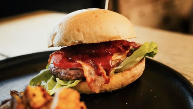 American bun classico senza semi, insalata romana, pomodoro ramato, burger di manzo bavarese (150gr), cheddar fuso, uovo all’occhio di bue, bacon croccante e salsa barbecue