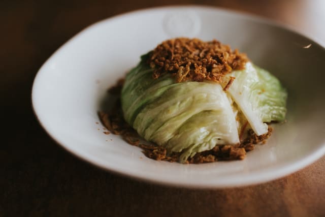 Risotto rico de sabores tradicionais, envolto na gulosa alheira, cogumelos, espinatres, salsa, cebola branca crocante desidratada e escondido em folha de couve lombarda