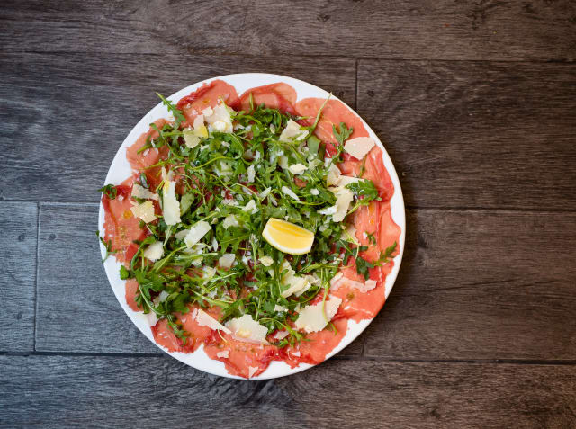 Fatias de carne de vaca finamente cortada com rúcula, cogumelos, aipo e lâminas de parmesão