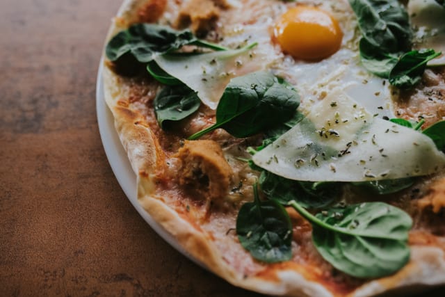 Mozzarella, cogumelos frescos picadinhos e salteados, aromatizados com limão e pasta de trufa preta, ovo e espinafres