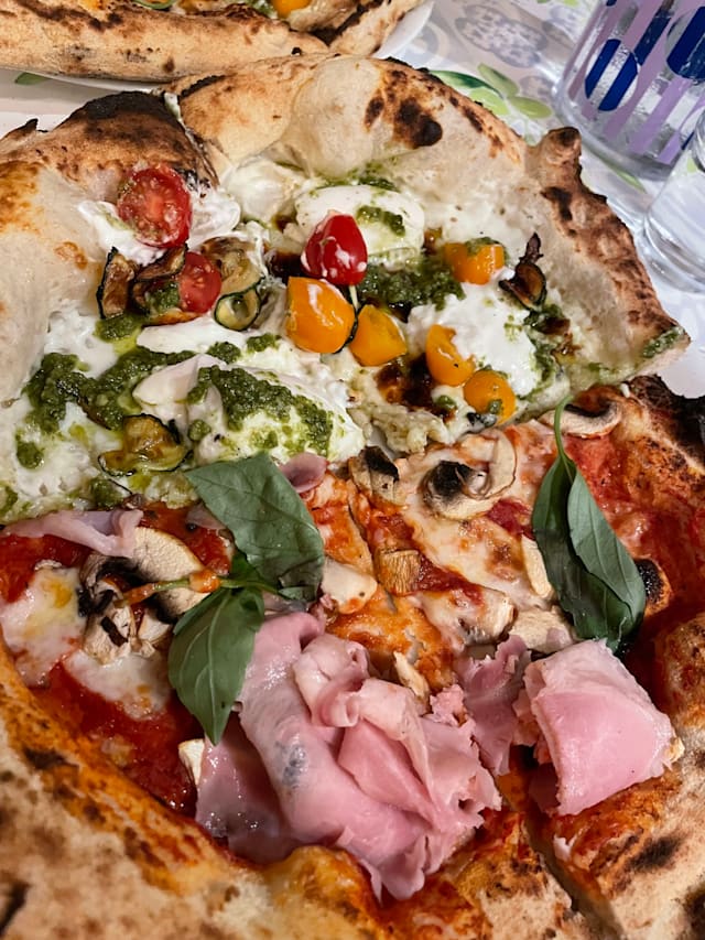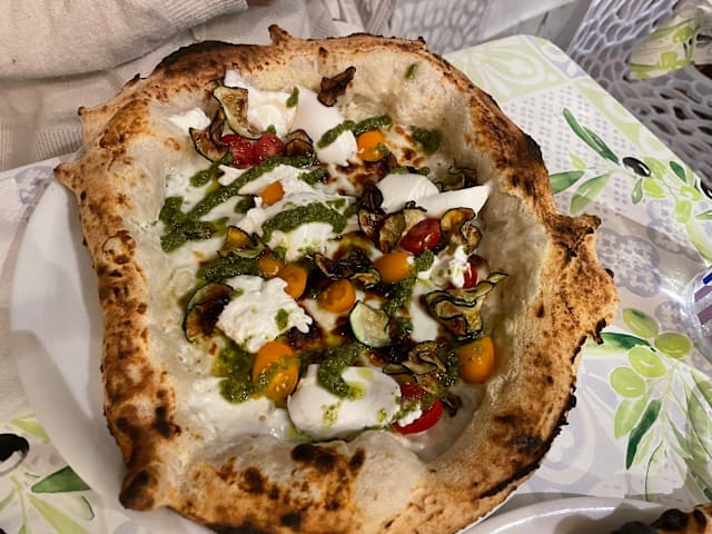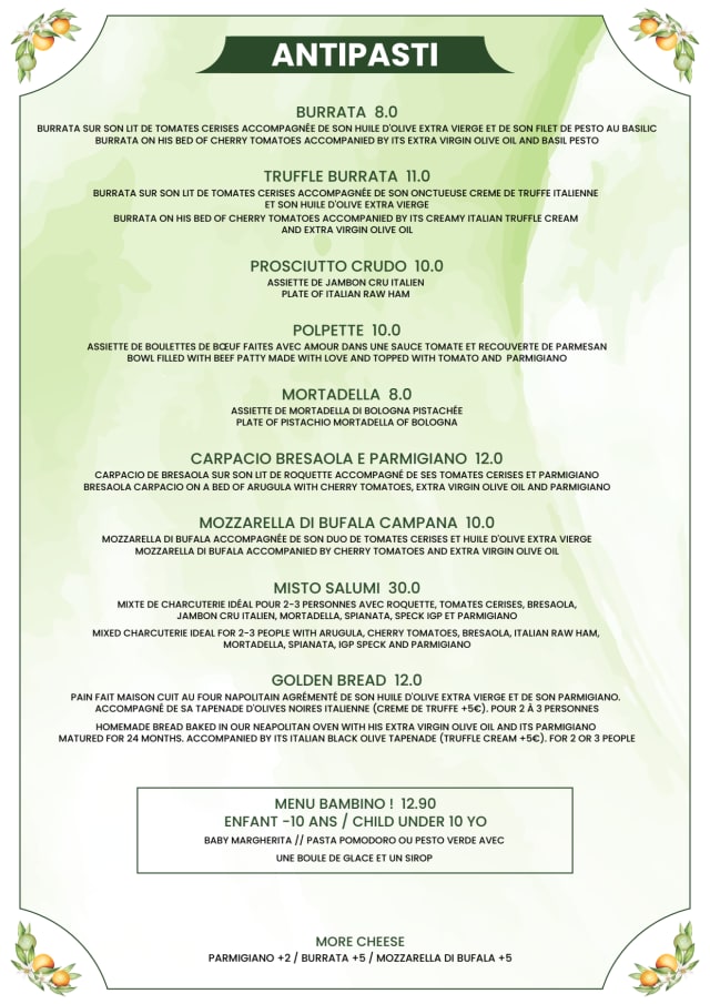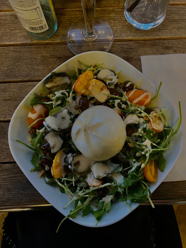 Salade, tomates cerises, crouton, oignons frit, courgettes frits, olives avec mozzarella di bufala ou burrata et sauce maison