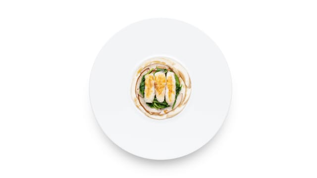 - Petto di faraona, mela verde, cipollotto bruciato, nocciole e bernese