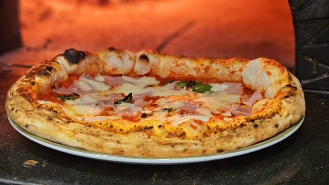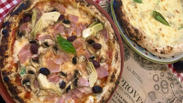 Tomate, mozzarella champiñones, jamón dulce, alcachofas y aceitunas negras