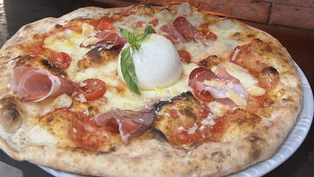 Tomate, mozzarella, speck, tomates cherry, rúcula, y virutas de parmesano