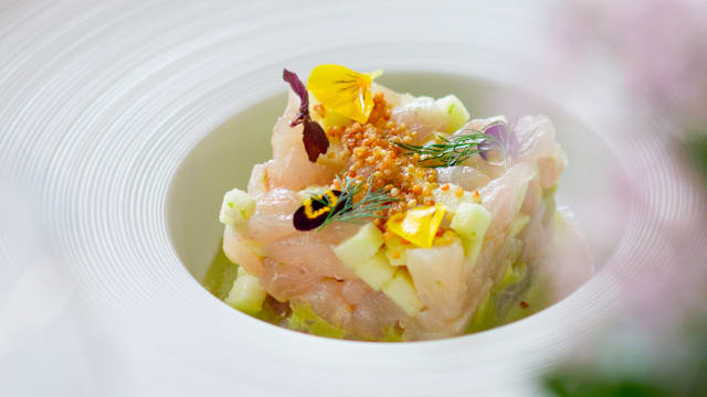 Tartare di branzino, mela verde, crumble di quinoa e dressing all’aneto
