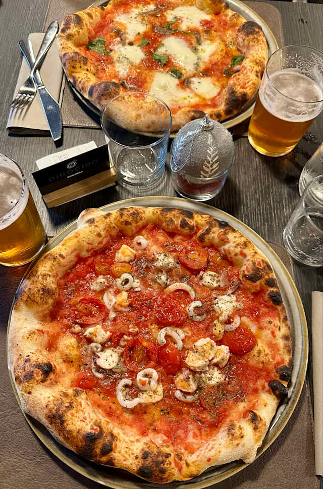 - (Impasto classic)passata di pomodoro pelato, polpo in doppia cottura, calamaro e mazzancolle marinati in olio, pepe e aglio, pomodoro pachino arrosto, olio extra vergine di corato e origano.