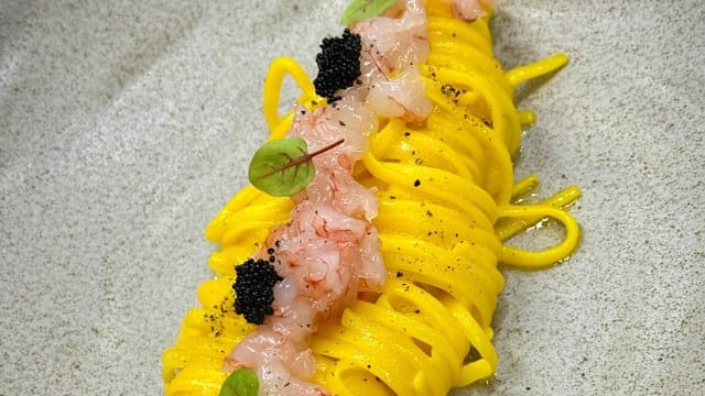 Taglioni all'uovo, mantecati con burro francese ,limone e zafferano, tartare di gambero rosso.