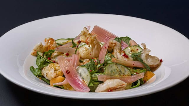 - Gamberi scottati, lattuga croccante, melone arancione, cetriolo, cipolla rossa marinata, dressing alla senape e miele, menta fresca e pepe rosa