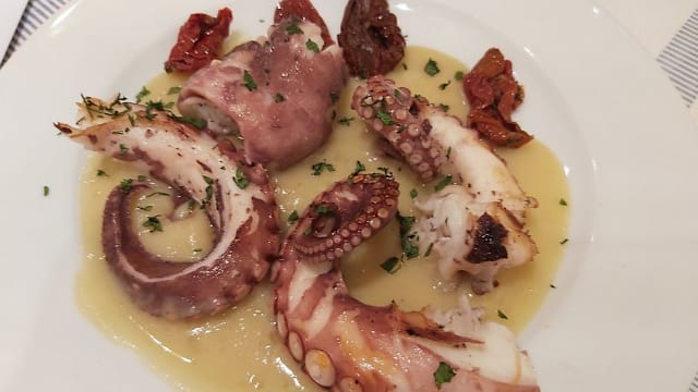 Polpo arrosto su vellutata di fave e pomodori secchi
