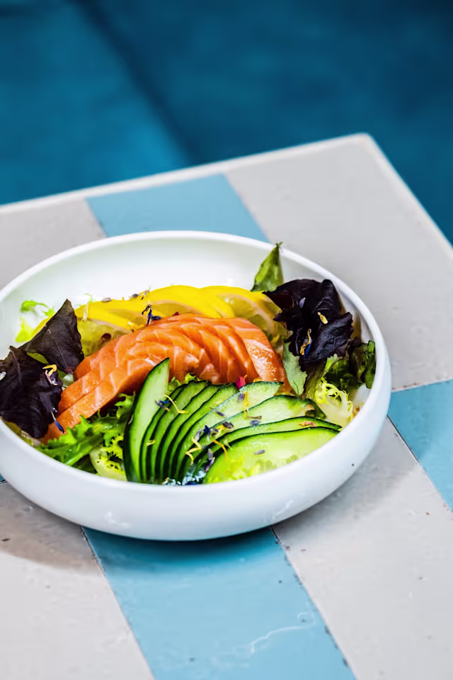 - Salmone, avocado, topping esterno di stracciatella, gambero rosso, tobiko e zest di limone.