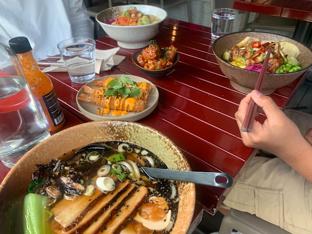 9/10The food is delicious, fresh, tasty and big portion, but we had to wait 45minutes to receive our order.The service is impersonal as you have to order an app.The locations is fine, by the water.