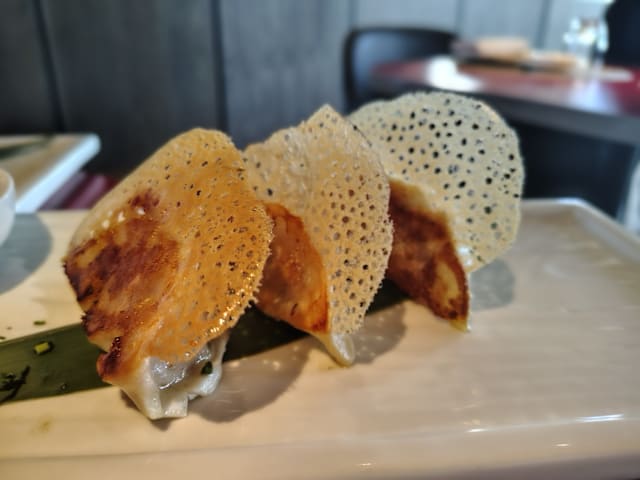 Coscia di pollo tenero cotto alla piastra, condita con la salsa di soia ostrica e arricchita con croccanti cialde di mandorle. Un piatto ricco di sapori e texture, dove la dolcezza delle mandorle incontra l'umami delle salse.