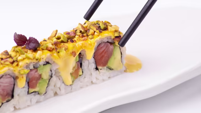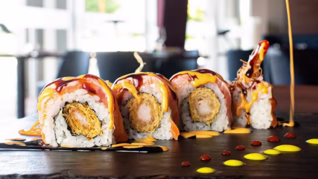 - Riso sushi avvolto in alga nori, guarnito con ricciola cruda frecsa, scampi delicati e una salsa agrodolce al passion fruit. Un piatto raffinato dove la dolcezza del pesce incontra l'esotico della frutta tropicale.