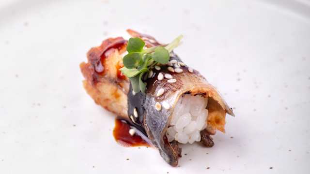 - Fetta di anguilla glassata (unagi) con salsa dolce, adagiata su una base di riso sushi leggermente aromatizzato all'aceto. Un piatto ricco e saporito, dove la dolcezza dell'anguilla incontra l'umami della salsa.