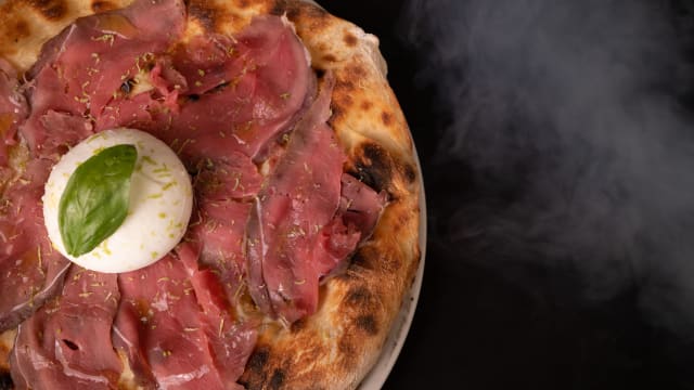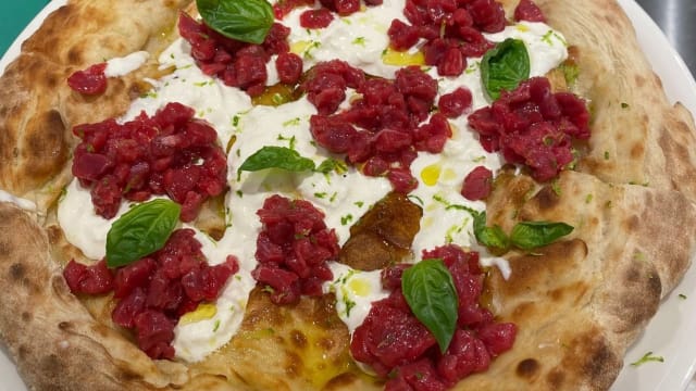 Pomodoro del nostro territorio, mozzarella fior di latte 100% italiana, guanciale croccante, cipolla rossa, pecorino romano dop e una spolverata di pepe nero