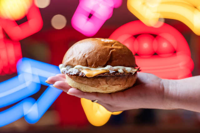 - Una carne, cheddar, bacon, huevo y salsa distrito