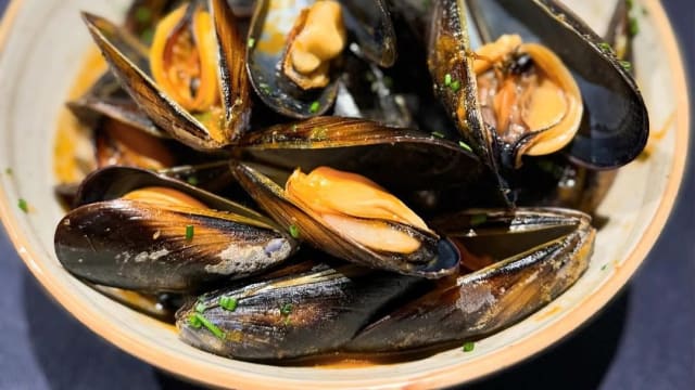 Mejillones, salsa a base de tomate, vino blanco, ajo y especias
