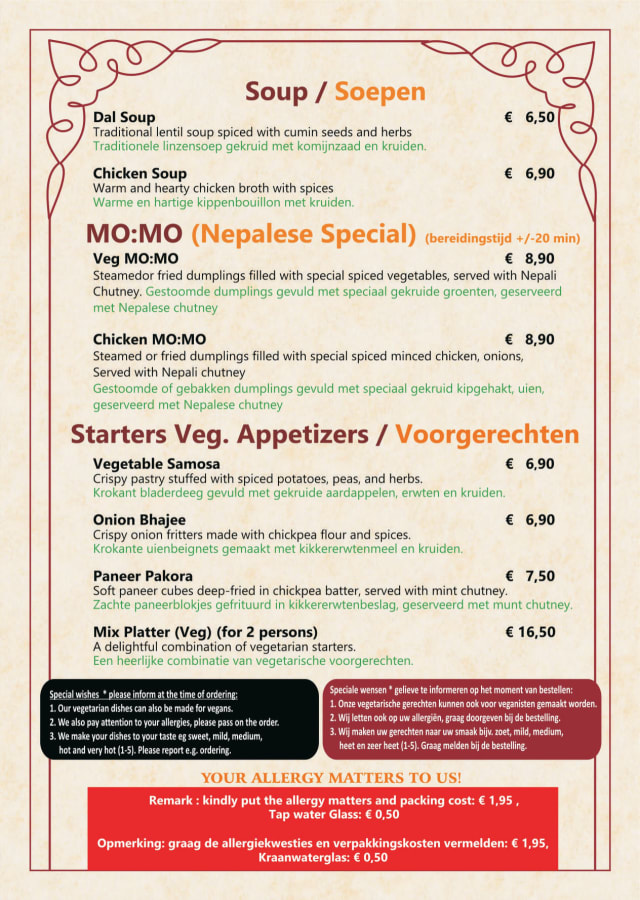 7.5/10Main Indian's dishes are on the menu. Tasty and well flavored. You can ask for your preference from no spicy to spicy for each dish. Nepali dishes are only per set menus. It could be a limitation in your choices. Service was okay. We will be back. Happy to have found an Indian specials in Amersfoort.