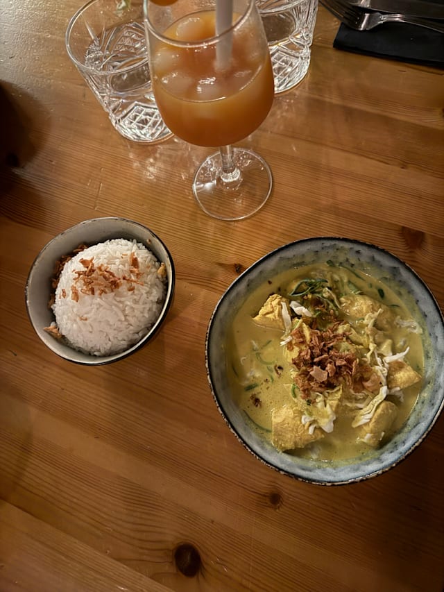 7.5/10Staff was friendly and helpful with the options on the menu. Food was good but could have hade more variety in the vegetables for the fried rice, served with two small chicken sticks which would have been ok if we didn’t have to pay extra for the dish.
