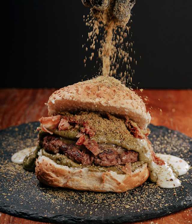 - Hamburger di manzo ragusano 200 gr, filante,crema di pistacchio homemade, fonduta granapadano D.O.P. e bacon nostrano.