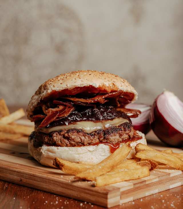 - Hamburger di manzo ragusano 200 gr, filante, cipolla caramellata, bacon nostrano e salsa BBQ.