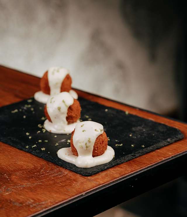 - Sfere di patate croccanti, mousse cacio e pepe homemade, scorza di limone.
