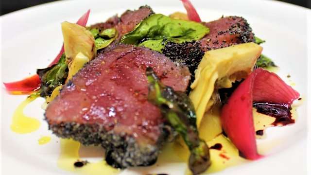 - Tataki di manzo con fiocchi di latte, ciliegie e noci tostate