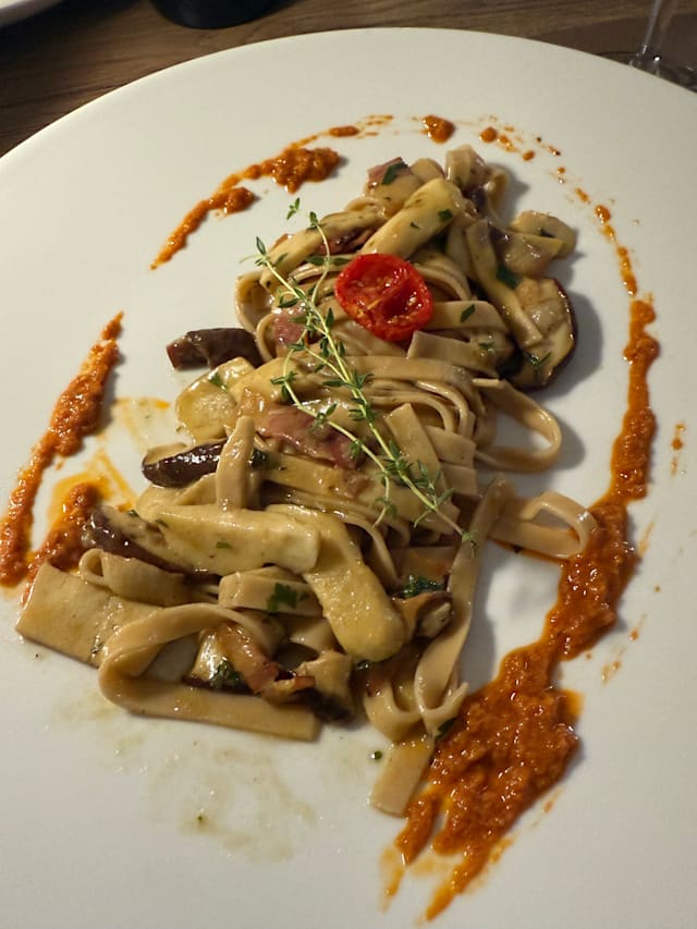 Tagliatella di farina di castagne ai porcini, guanciale trito di pomodorini infornati