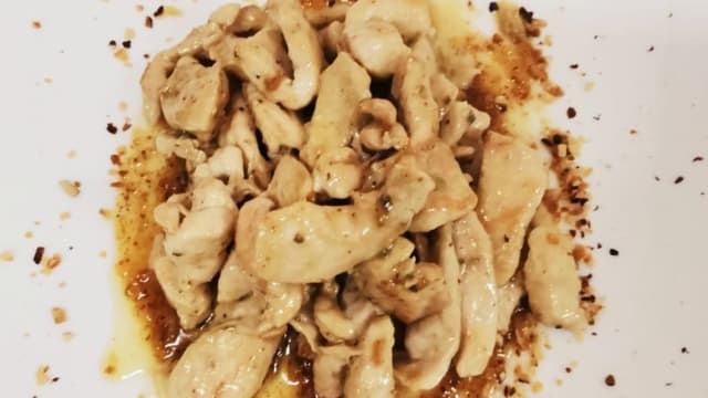 Insalata verde, straccetti di pollo, rucola, ciliegino, grana, glassa di aceto balsamico