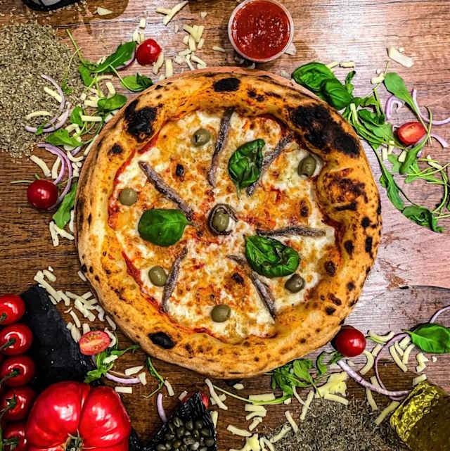 - Sauce tomate, mozzarella, anchois, câpres et olives.