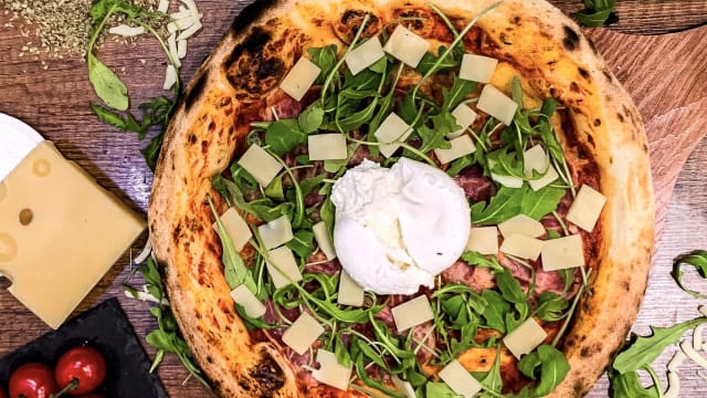 Crème de truffe noire, crème fraîche, burata crémeuse, jambon de dinde, parmesan et roquette.