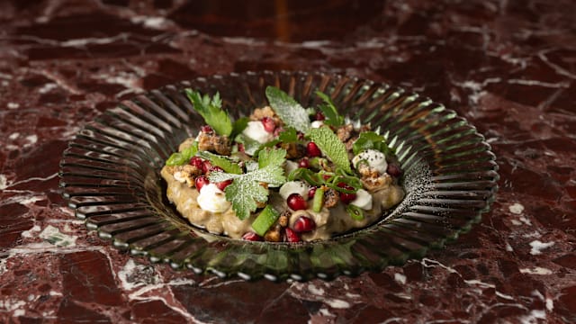 - Rödbetshummus, stracciatella, pistage, kronärtskocka
