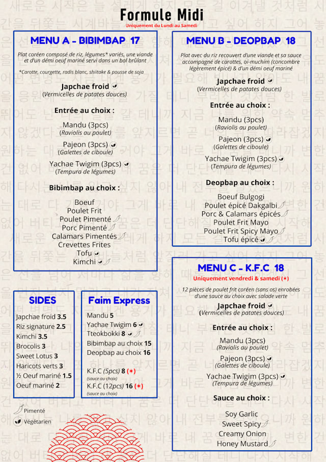 8.5/10This restaurant was a great find and within walking distance from my hotel. Unsure with my French-speaking skills, he knew I was Anglais. The host offered me an English menu. Food was great and service was prompt. The bibimbap bowl looked small to me but after digging in, I knew this was going to be a great meal. I finished everything including the banchan.