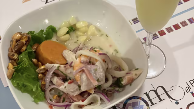 - Dados de peixe y una mixtura de mariscos ,cebola roxa ,aji limo,coentros alinhados con limao y aconpanhado de batata doce ,milho peruano y canchita de chulpe