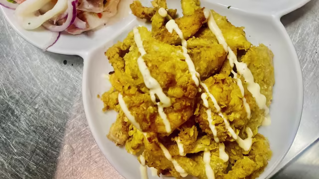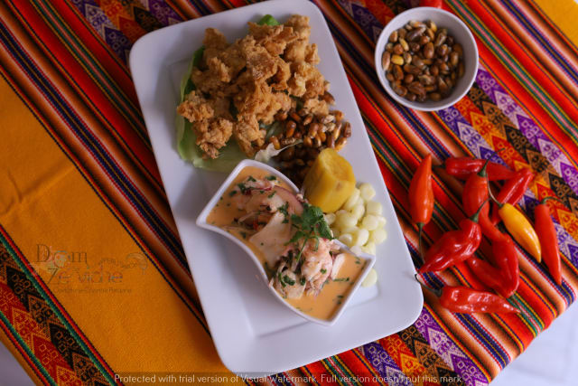 - Dados de peixe y mixtura de mariscos ,cebola roxa ,aji limo,coentros ,alinhados con limao y crema de piri piri peruanos, aconpanhado de fritos de pota , batata doce ,milho peruano y canchita de chulpe