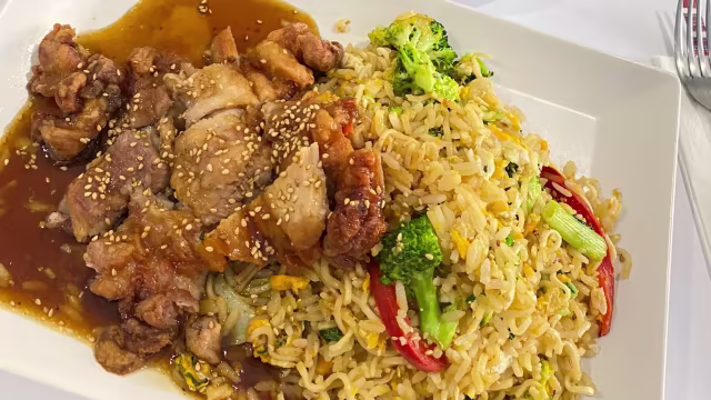 - Frango salteado con cebola roxa ,tomate y aromas de coentro vino y molho de soja ,acompanhado de arroz y batata frita