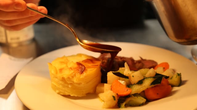 Mit bratkartoffeln oder kroketten, gemüse, pinot noir sauce