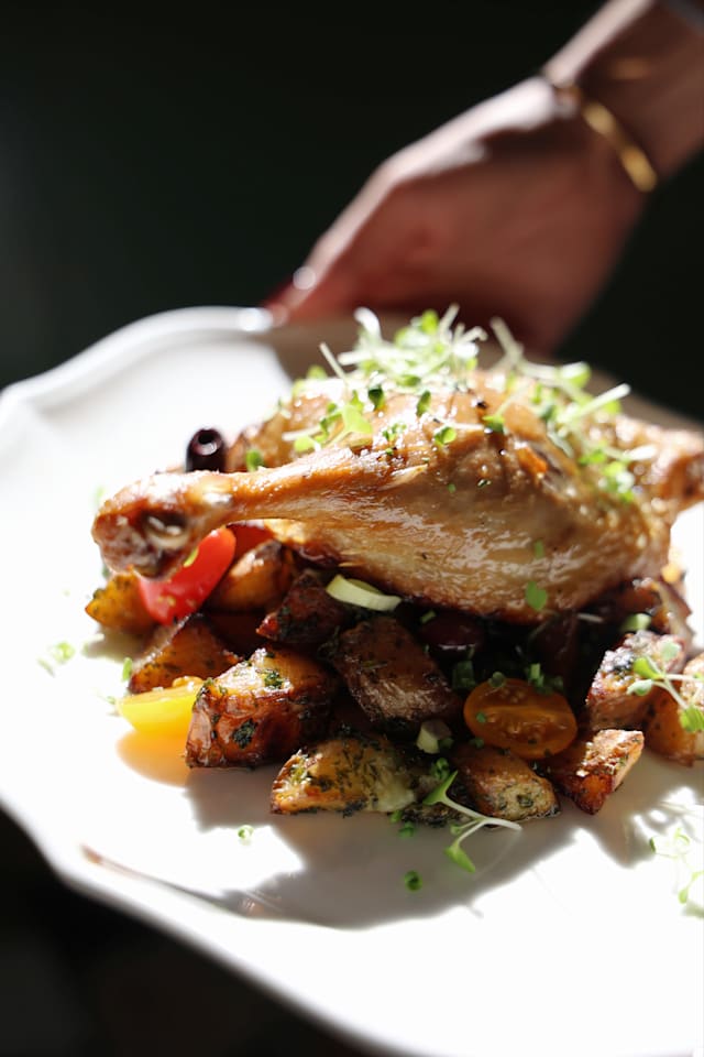 - Rôti au feu de bois, accompagné de ses pommes de terre persillées et croutons