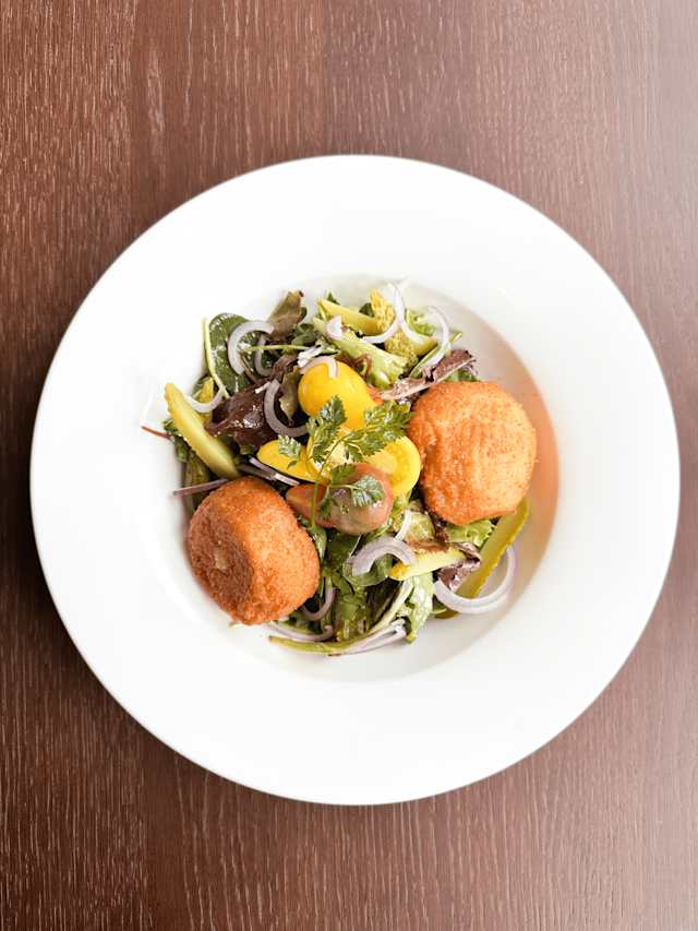 - Œuf au plat, lard de Bégnins et salade