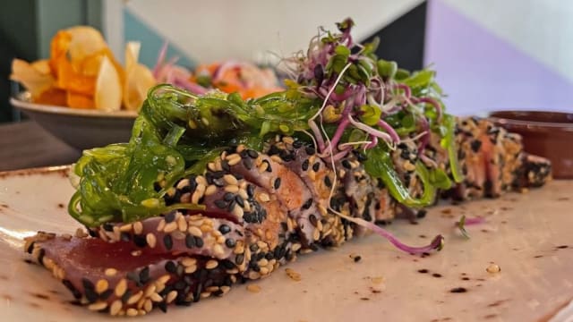 - Dados de atún rojo marinado en salsa de soja con un ligero toque de wasabi, con aguacate y un toque de sésamo tostado