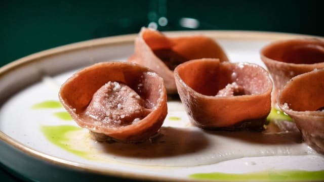 Tartare di fassona presidio slow food, terra di noci, maionese all'aceto balsamico, gel di parmigiano ed emulsione di erba cipollina.