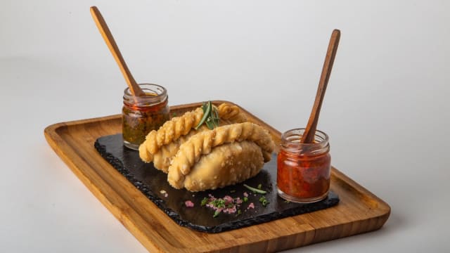 Milanesa de ternera angus lijeramente empanada y crujiente, con una mezcla de 4 quesos, salsa criolla y chimichurri