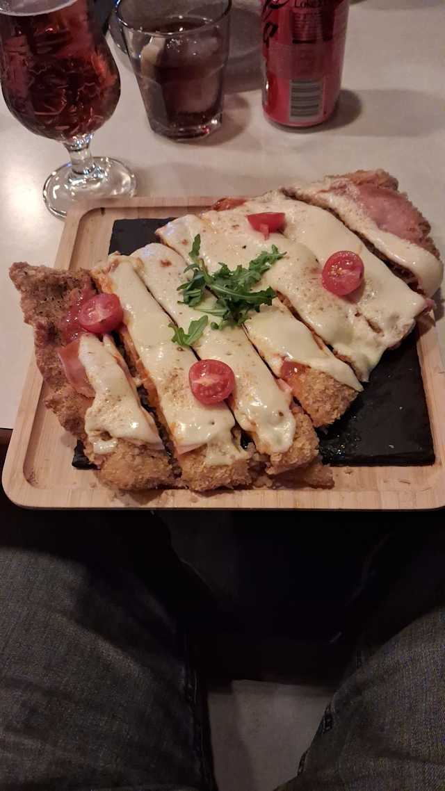 Bistec de ternera empanado y frito recubierto de tomate natural, jamón cocido y queso gratinado al horno.