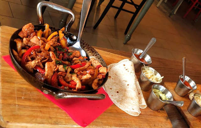 - Striscioline di pollo e manzo marinati e saltati in padella con cipolle e peperoni in puro stile messicano. Accompagnate con salsa guacamole salsa piccante, formaggio mix e morbide tortillas di grano